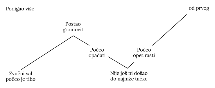 Primjer (155) također počiva na gradaciji u prikazivanju zvučne slike. Zanimljivost tog primjera najviše je u tome što je gradacija složenija, tako da joj odgovara ovakav shematski prikaz: