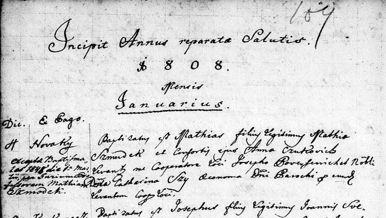 3 Matična knjiga krštenih (s čije smo prve unutarnje stranice prenijeli latinski »naslov«), koja sadržava upise od 1798. do 1856., pohranjena je u Hrvatskome državnom arhivu u Zagrebu, gdje se u Zbirci matičnih knjiga vodi pod brojem 736. U istraživanju smo se služili digitaliziranom inačicom mikrofilmirane matice dostupne na internetskoj stranici FamilySearch.