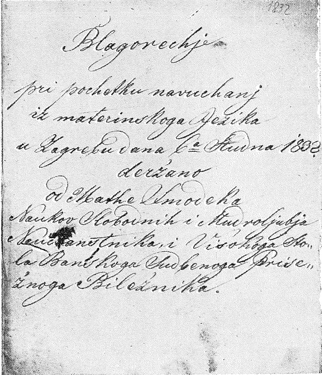 najvažnejshi posli od zvelichenja mile nashe Domovinice napervojemlu se (...) Samo ti i Rakovec v Krapini zaspaste, i na Domovinu (inache misliti nemorem) pozabiste. Nevredne vas nahadjam, da bi vam pisal, koji su posleniki za zbor zebrani, i kaj se za oli proti Domovini dela. Jedino Vam obznanujem, da sem 6. ovoga meseca zachel opet horvatski vuchiti. (...) Slovnica je gotova, za koji vre dan, dam podpisnike pobirati, kaj i tebe prosim, poberi je tam, ako koji budu, neg tak, da vsaki mahom plati 40 x. srebra za komad; zishla pako bude iz Slovotiske Franje Suppana, na koncu meseca Szechna (Februara) doiduche leto 1833., zdelana je v horvatskom i nemachkom jeziku s opazivanjami na Slavonsko i Dalmatinsko podnarechje. Jedino bi želel, da bi se predi, kak v' shtampu poide, med nami po navadi prechtela. Ako vas na zkorom nebude, ja vas chakal ne bum, neg ja Jurjevichu za preceniti dam, i za tem Suppanu. (Deželić 1909: 174)10