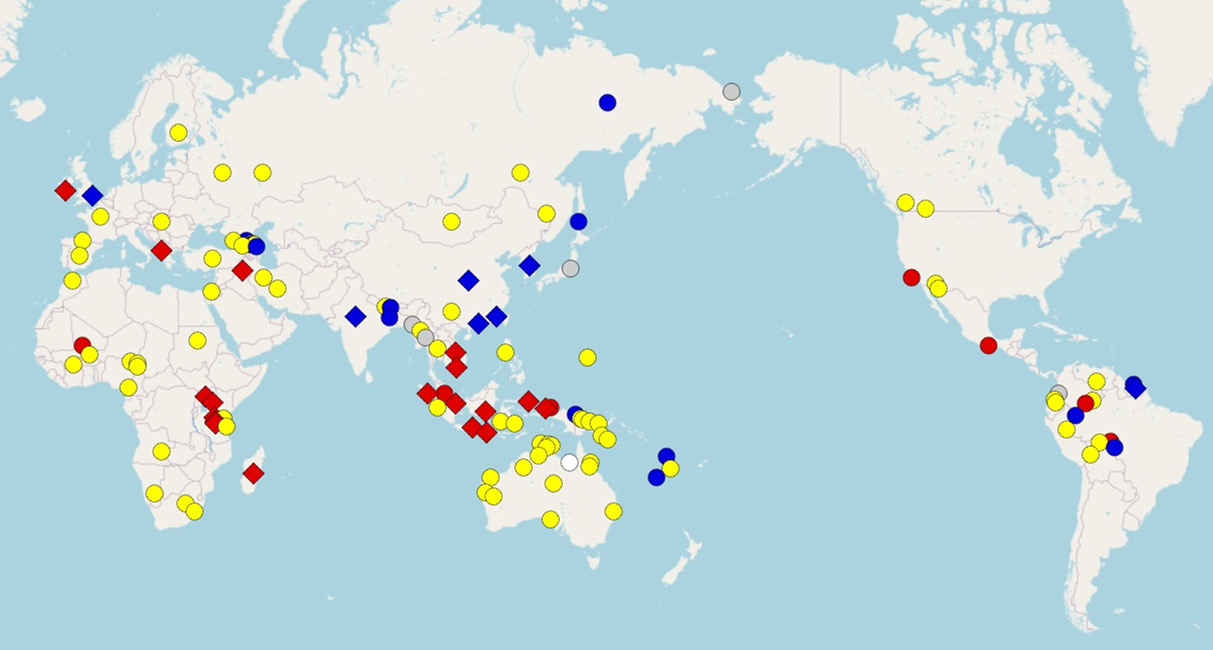 Mogućnost da se pridjev samostalno pojavi u imenskoj sintagmi, bez imenice kojoj je pridružen i koju modificira, kao u izrazu Želim crvenu jabuku → Želim crvenu, govornicima hrvatskoga i srodnih jezika vjerojatno se čini normalnom i očekivanom, štoviše trivijalnom. Međutim provedena tipološka istraživanja pokazuju da je među jezicima svijeta situacija s tako osamostaljenim pridjevima ipak razvedenija nego što bi se na prvu pretpostavilo. Gil (2013) u sklopu tipologijski poznatoga Svjetskog atlasa jezičnih struktura (World Atlas of Language Structures – WALS) na probranu je, reprezentativnu uzorku od 124 jezika istražio kako se vladaju pridjevi bez imenica, tj. postoje li različite strategije iskazivanja slučajeva kada je “imenica ili nevažna ili se može rekonstruirati iz diskursa i odsutna iz konstrukcije, pa kao rezultat toga pridjev ostaje glavna leksička jedinica unutar imenske sintagme, denotirajući predmet koji se podrazumijeva” (ibid.). Upravo takve konstrukcije pridjeva bez imenica proučava među odabranim jezicima svijeta i dijeli ih na sedam tipova.16 Geografska distribucija konstrukcija prikazana je na Slici 1, a objašnjenja korištenih oznaka odnosno opisi tipova dani su u Tablici 2.